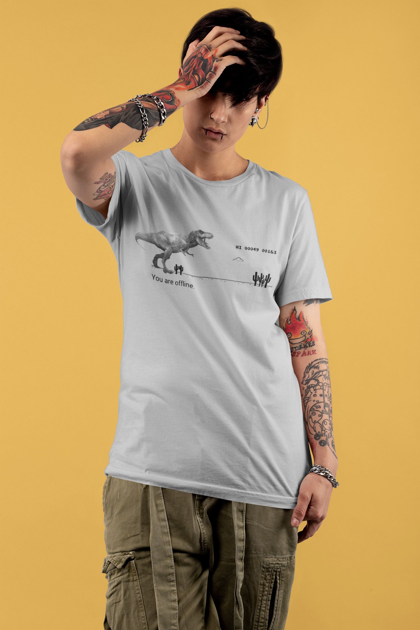 Camiseta preta estampa Exclusiva, faz referência ao jogo T-Rex escondido no navegador Google Chrome que você pode reproduzir somente quando você está offline, e aproveitamos para add um baita T-rex para ter um double de Jurassic Park